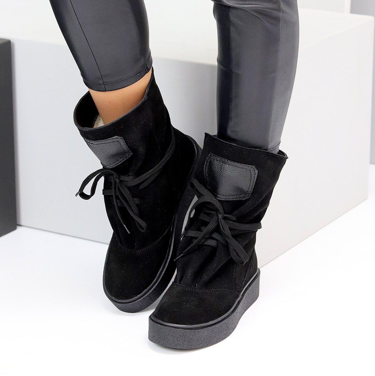 Замшеві жіночі чоботи зимові на шнурівці молодіжні модні чорні натуральна замша