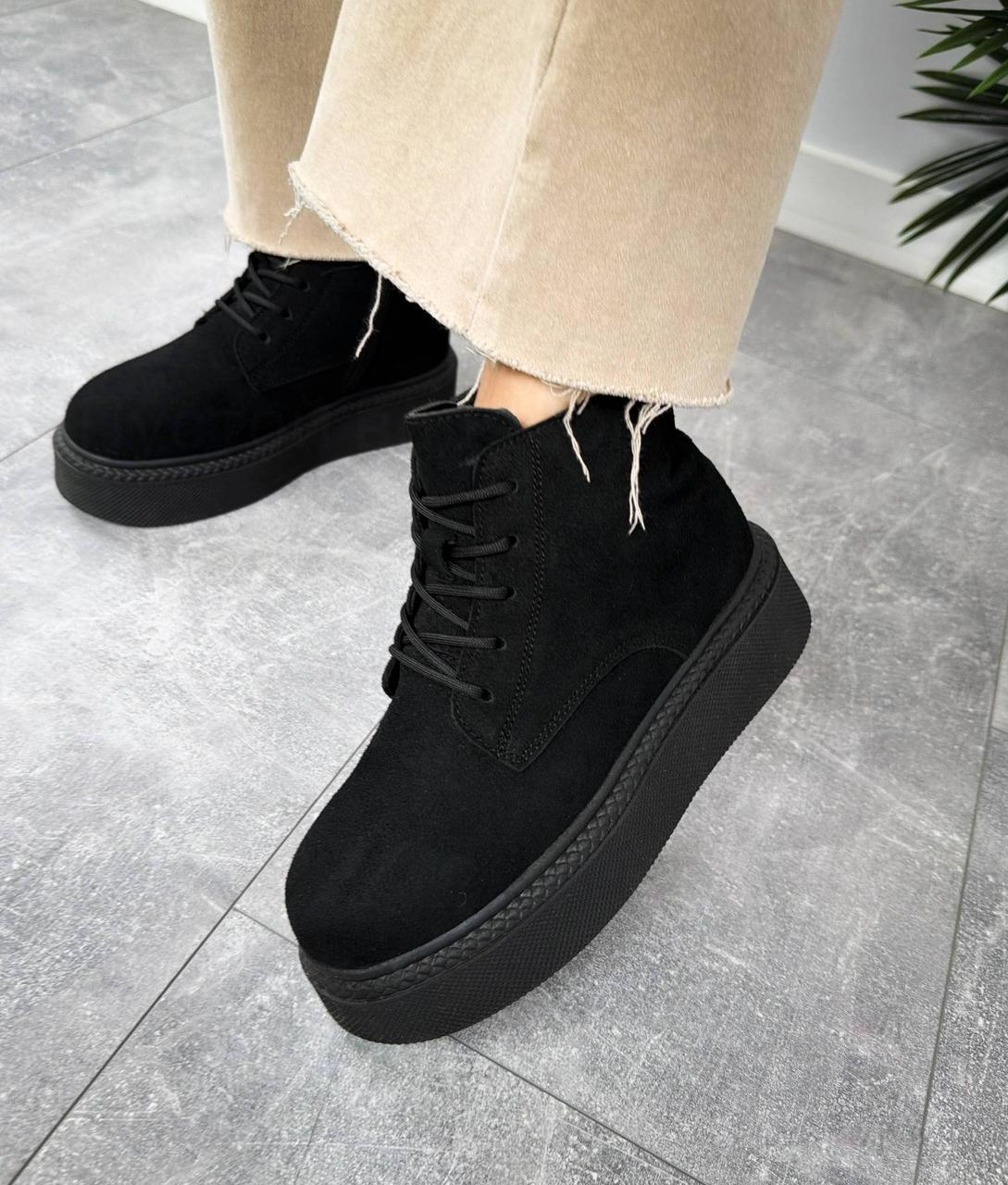 Жіночі зимові черевики з хутром тедді на шнурівці та блискавці чорні натуральна замша
